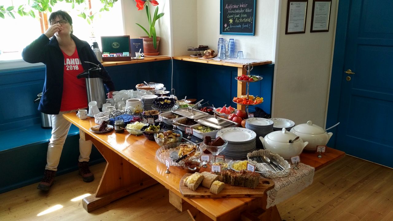 Skriduklaustur a dokładnie mieszcząca się tam Klausturkaffi, to rodzinna, nastrojowa restauracja, w której w godzinach 12-14.30 serwowany jest lunch w formie szwedzkiego stołu oraz od 17 łakocie dla łasuchów.  Za bardzo przystępną jak na Islandię cenę 3400 koron można kosztować do woli wspaniałych potraw kuchni islandzkiej. Przepyszne zupy, potrawka z jagnięciny, potrawka z renifera ( tej nie mogłam przełknąć bo kocham renifery), przepyszne ryby, zapiekanki, chlebki własnego wypieku, przystawki, dodatki, wszystko domowej roboty, obłędnie smaczne z prawem dokładek do upadłego.  Na deser 3 ciasta, owoce, kawka i herbatka. Ludzie! To była prawdziwa uczta. Przemiły personel wciąż uzupełniał dania i dbał o niezwykła atmosferę tego miejsca. Polecamy wszystkim, warto zjechać ze szlaku. W budynku, który ma wspaniałą historię, jest Izba pamięci, coś na kształt Muzeum Regionalnego, też warte zobaczenia.