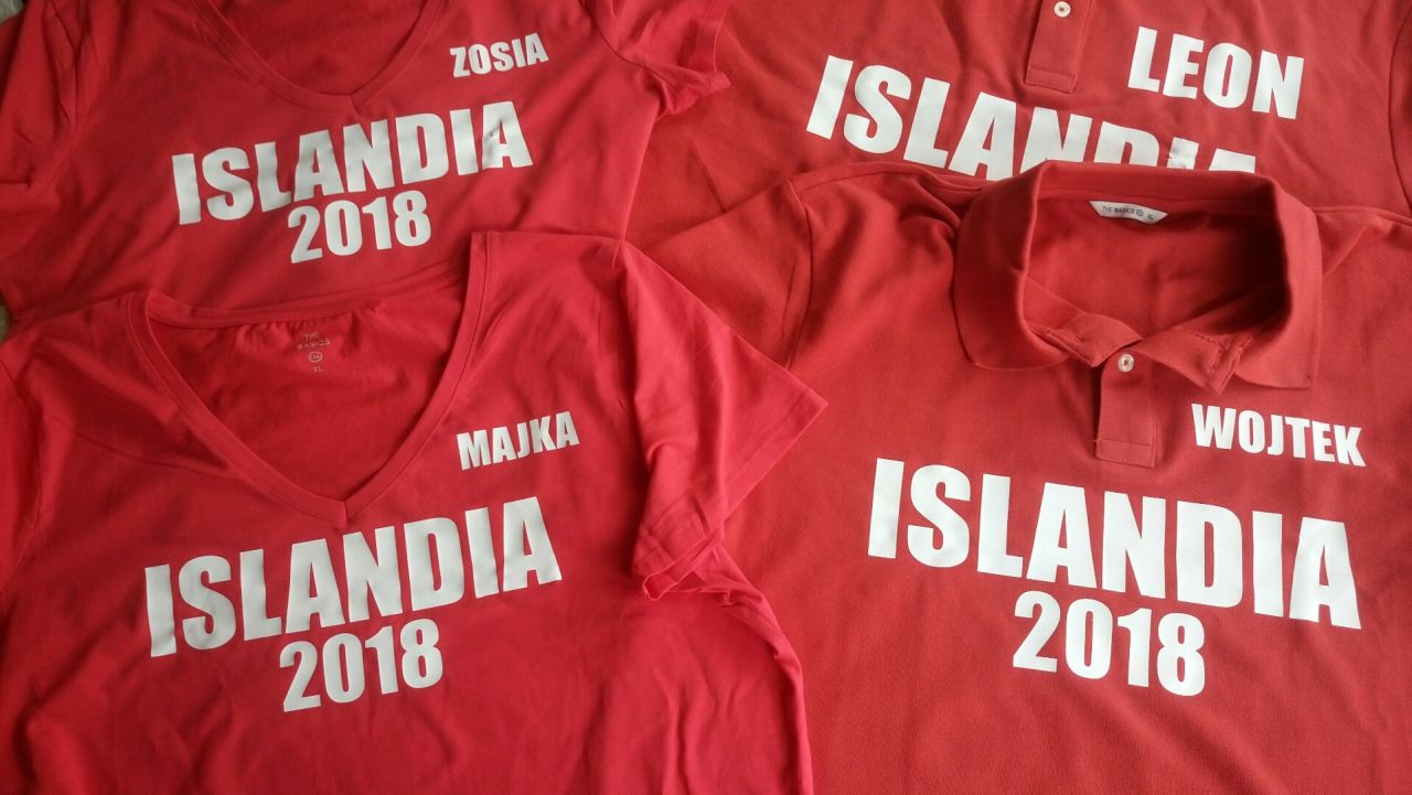 Najczęściej podróżujemy sami. Mamy jednak sprawdzonych kompanów, naszych przyjaciół, którzy tym razem towarzyszyli nam w wyprawie na Islandię. Islandia to nie jest  łatwa wycieczka i sprawdzone towarzystwo, pod każdym względem, bardzo się przydaje. Co więcej, nasz przyjaciel w czasie wyprawy obchodził urodziny, co było fantastycznym wydarzeniem.  Z tej okazji przygotowałam dla niego prezent, a właściwie prezent dla nas wszystkich. Pamiątkowe koszulki  nosiliśmy z dumą przez cały czas wyprawy.